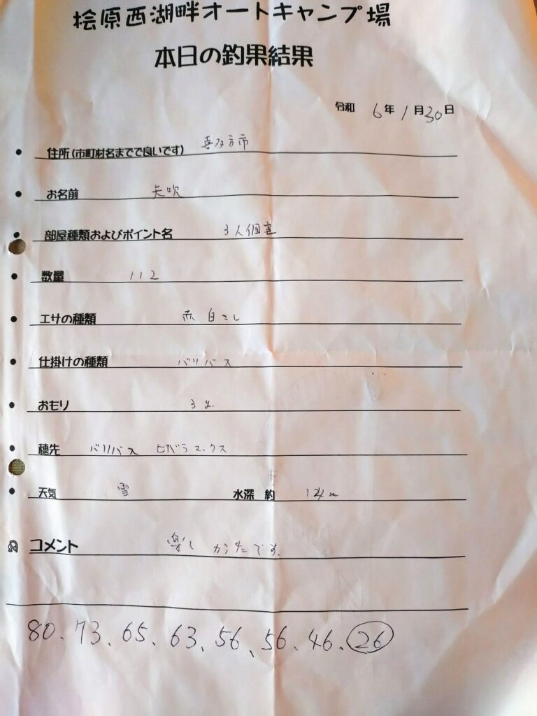 2025年1月31日 / 最終更新日時 : 2025年1月31日 hibaranishi ワカサギ R7.1/30 本日のワカサギ釣果 1月30日 木曜日 大雪★トンネル下ポイント(個室) 喜多方市 矢吹様 112尾★氷上マイテント 300尾 トンネル下ポイントはなかなか難しい日となってしまったようです…。棚も、底から表層までバラけていたらしく、プラス居ても食わない現象到来か???💦氷上も、大雪の影響で中々穴開けも大変だったみたいです😓