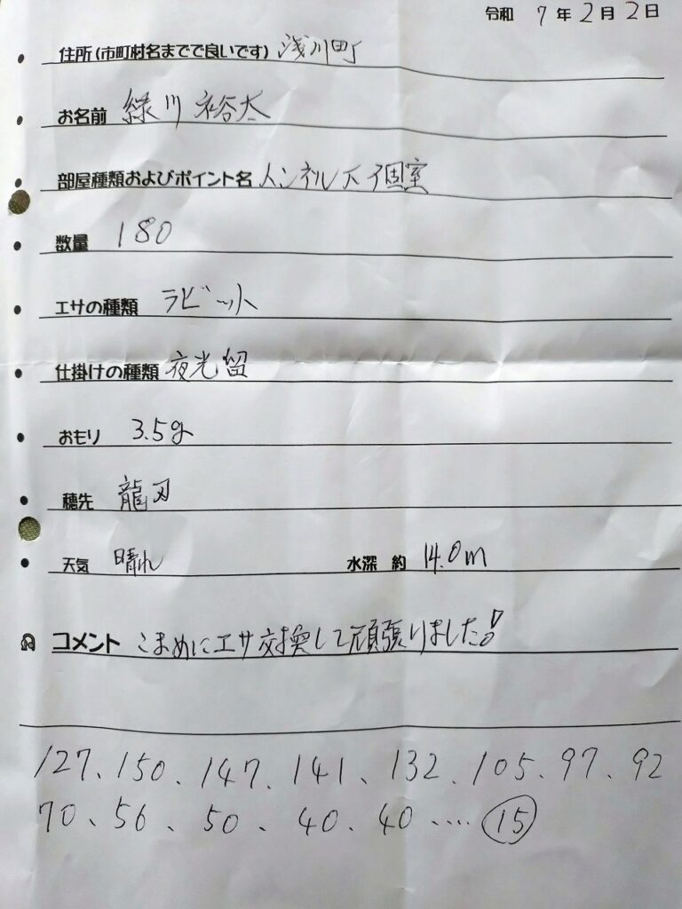2025年2月3日 / 最終更新日時 : 2025年2月4日 hibaranishi ワカサギ R7.2/2 本日のワカサギ釣果 2月2日 日曜日 晴れ★トンネル下ポイント(個室) 浅川町 緑川様 180尾★氷上マイテント 宮城県 齋藤様 606尾 380・350… トンネル下ポイントは相変わらずな感じだったようです…。氷上穴釣りがはじまるとサカナもバラけますね…😓氷上マイテント組も、良かった方・ダメだった方と様々でしたが、今日は天気も良く楽しんでいたようです🤗