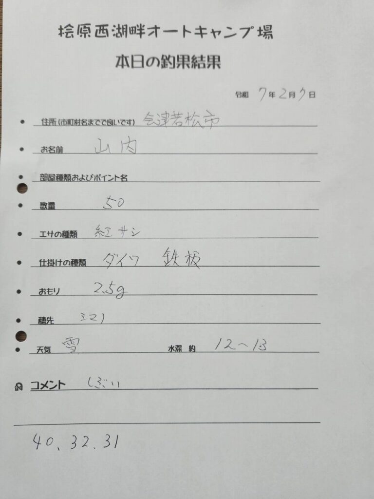 2025年2月8日 / 最終更新日時 : 2025年2月8日 hibaranishi ワカサギ R7.2/7 本日のワカサギ釣果 2月7日 金曜日 大雪★トンネル下ポイント(乗合船) 会津若松市 山内様 50尾★氷上はお休み致しました。 氷上は腰以上の積雪状態でした。明日は氷上解放する予定ですが、雪が深すぎる為、モービル送迎は不可能となる可能性大でございます。歩きのみとなりますが、かんじき・スノーシューをご持参下さい!!!トンネル下ポイントは、気圧の変化の影響ですかね…。居ても、食わない状態のまま1日終了してしまったようです😭