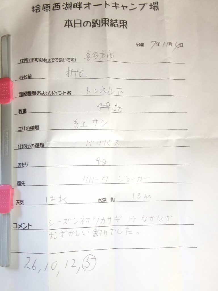 2025年11月5日 / 最終更新日時 : 2025年11月5日 hibaranishi ワカサギ R7.11/4 本日のワカサギ釣果 11月4日 火曜日 晴れ★トンネル下ポイント(乗合船) 喜多方市 折笠様 50尾 難しい状況は変わりなしです!!!やはり、外道がジャマしてくるようです。今日も鯉に仕掛けをブチ切られたようです😅