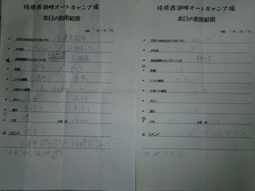 2025年11月9日 / 最終更新日時 : 2025年11月10日 hibaranishi ワカサギ R7.11/8 本日のワカサギ釣果 11月8日 土曜日 晴れ時々曇り★トンネル下ポイント(個室) 会津若松市 匿名 84尾 ※写真なし。★橋の下ポイント(貸切小屋) 郡山市 匿名 43尾 群れの出入りはあるようです。ただ、やっぱり食いがイマイチのようです😭根気との勝負ですね。