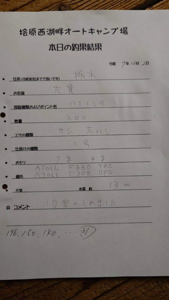 2025年12月2日 / 最終更新日時 : 2025年12月2日 hibaranishi ワカサギ R7.12/2 本日のワカサギ釣果 12月2日 火曜日 曇り時々晴れ★橋の下ポイント(乗合船) 栃木県 大貫様 200尾 12月に入ったとたん、何だか一気に変わってきましたが…ここで終わらずどんどん上昇していってほしいですねぇ~。 しかし、今日の群れの入りは半端じゃないくらいでした。…とは言え、食い気的にはパッとしないので、大事に大事に1尾ずつ釣るような感じでした。画像は、今日イチの魚影です。ここまでじゃなくても、棒状の群れがランダムにほぼ途切れることなく入ってきてました。この群れがやる気スイッチ入ったらやばかったでしょ~ねぇ~。 型はバラバラでした。濃い群れほどちびっこが多かったですね。