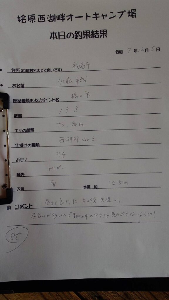 2025年12月6日 / 最終更新日時 : 2025年12月6日 hibaranishi ワカサギ R7.12/5 本日のワカサギ釣果 12月5日 金曜日 雪★橋の下ポイント(乗合船) 福島市 佐藤様 133尾午前中で3桁まで到達したものの、昼頃から失速してしまったようです😭雪はだいぶ降り積もりました…。土日と晴れる予報ではありますが、逆に朝イチの移動は凍結しておりますので、じゅうぶんにお気をつけてお越しください🚗