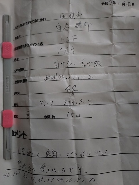2026年1月4日 / 最終更新日時 : 2026年1月5日 hibaranishi ワカサギ R8.1/4 本日のワカサギ釣果 1月4日 日曜日 曇りのち雪★トンネル下ポイント(乗合船) 田村市 白岩様 163尾 群れが入ってきても、食い気なし…。いかに興味をもたせ仕掛けに寄ってきてくれるか…が腕の見せ所ですねぇ☺♡ 誘い方やエサでも全く違いますもんね!!! 不思議ですよね(。´・ω・)?