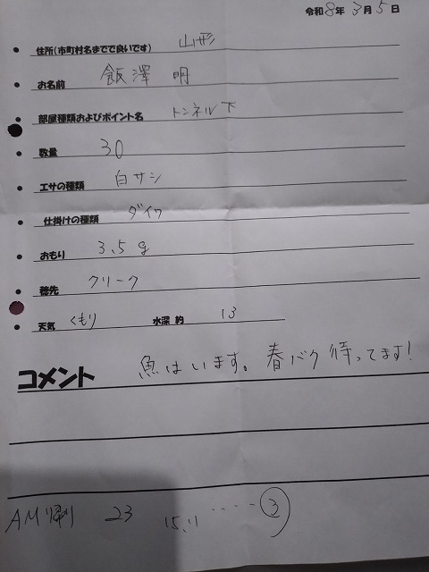 2026年3月5日 / 最終更新日時 : 2026年3月7日 hibaranishi ワカサギ R8.3/5 本日のワカサギ釣果 3月5日 木曜日 曇り★トンネル下ポイント(乗合船) 山形県 飯澤様 30尾 食欲が回復しませんねぇ~😭暖かくなったり…寒くなったり…気候も安定せずの日々ですし、釣果も安定しませんよね。